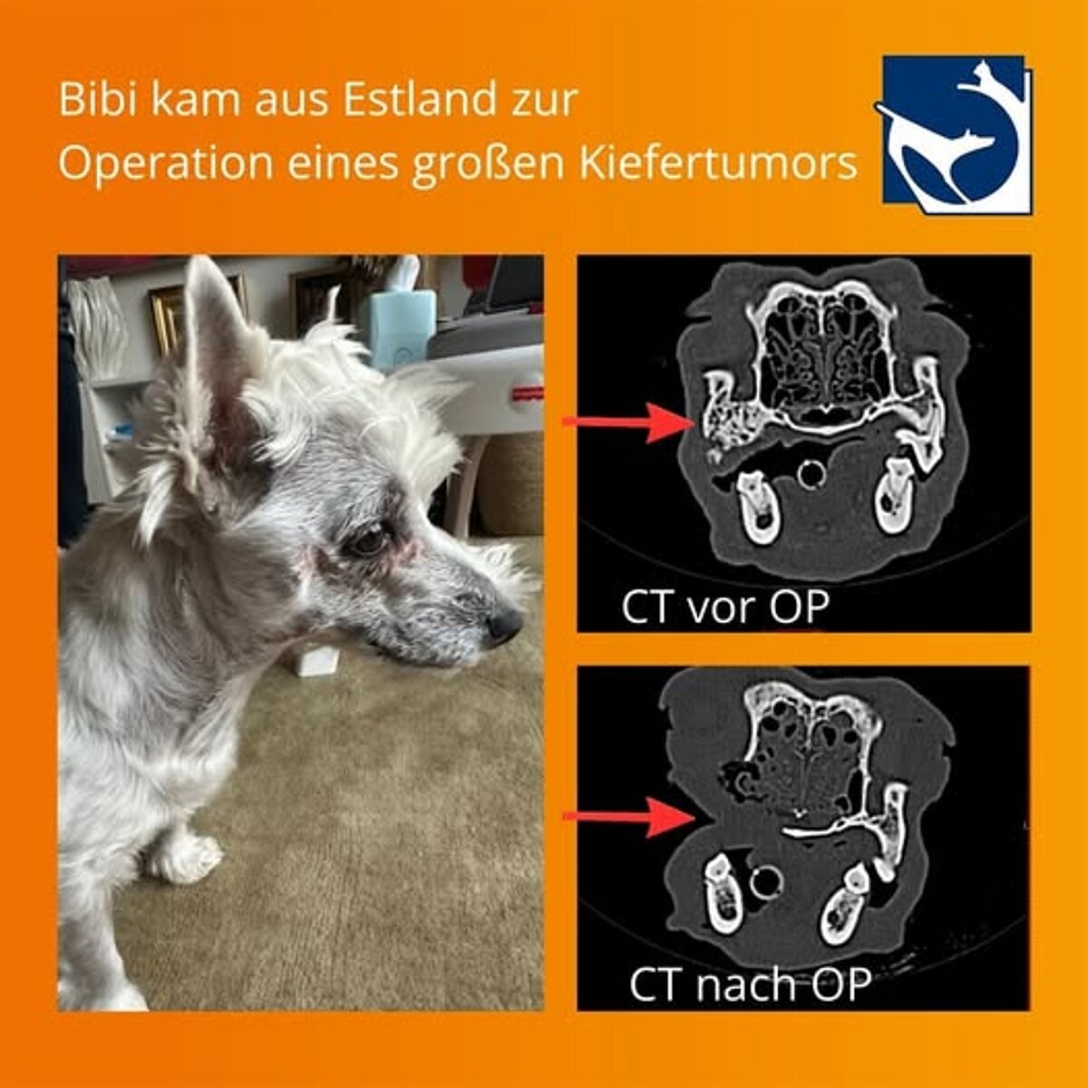 Bibi ist eine 11–jährige West Highland White Terrier–Dame, die extra mit ihrer Besitzerin aus Estland zu uns angereist ist. Sie hatte vorberichtlich ein großes Plattenepithelkarzinom, einen bösartigen Tumor, im Oberkiefer und wurde für weiterführende Diagnostik und eine eventuelle OP zu uns überwiesen.