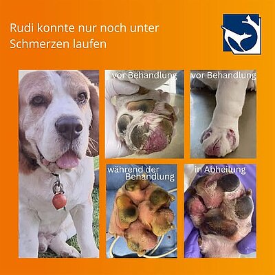 Rudi ist ein achtjähriger Beagle, der erstmals 2023 wegen einer schlimmen Pododermatitis, also einer massiven Entzündung der Haut an den Pfoten vorgestellt wurde. An den Pfoten beider Vordergliedmaßen bestand eine Schwellung und Rötung und eine sogenannte Pseudoballenbildung und Furunkulose zwischen den Zehenballen. Diese Erkrankung sehen wir rassebedingt beim Beagle häufig, zugrundeliegend ist meist eine canine atopische Dermatitis, eine genetisch bedingte Hautkrankheit bei Hunden, die meist durch eine Überempfindlichkeit gegenüber Umweltallergenen ausgelöst wird. Hinzu kommt die Fehlbelastung durch Übergewicht und orthopädische Probleme.