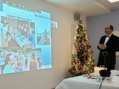 Stellvertretend für das ganze Team lauschte das Team der Klinikleitung (natürlich geimpft, getestet und mit Maske) der traditionellen Weihnachtsrede von Herrn Dr. Kosfeld. Ein großer Teil des Teams verfolgte die Ansprache an den Bildschirmen.