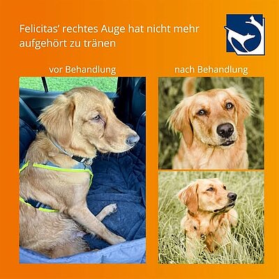 Die einjährige Golden-Retriever-Hündin Felicitas kam ursprünglich ganz routinemäßig zu uns zur Röntgenuntersuchung von Hüfte und Ellenbogen (HD/ED). Doch weil ihr rechtes Auge auffällig vermehrt tränte , wurde sie zusätzlich in unserer ophthalmologischen Sprechstunde vorgestellt. Die Ursache: ein ventrales Mikropunktum – also ein zu kleines unteres Tränenpünktchen, durch das die Tränen nicht richtig abfließen konnten und permanent über das Gesicht liefen. Das Tränenpünktchen wurde chirurgisch erweitert und schon 8 Tage nach der OP zeigte sich ein tolles Ergebnis: kaum noch Augenausfluss und eine rundum glückliche Felicitas . Und auch 6 Monate später gilt: Die Tränendrainage funktioniert weiterhin einwandfrei. Felicitas hat jetzt wirklich keinen Grund mehr, ein Auge voller Tränen zu haben .